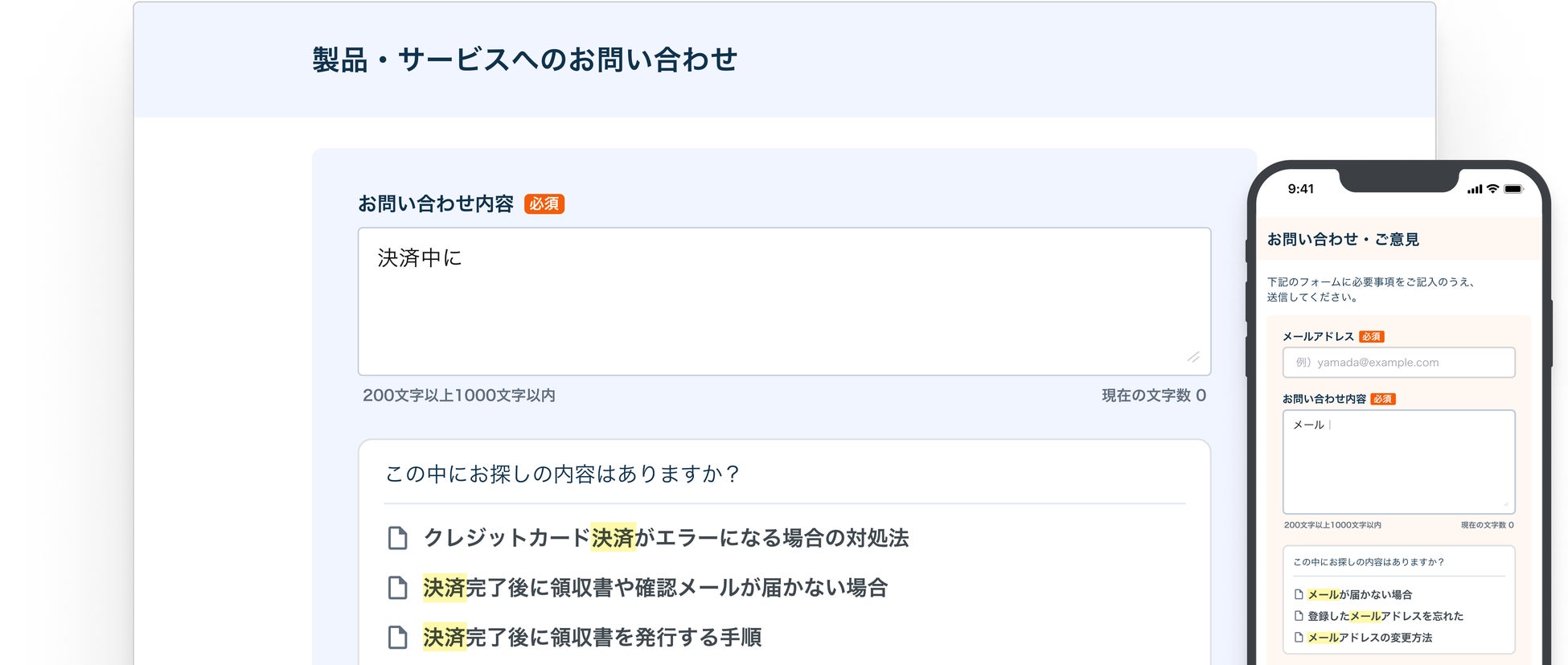 問い合わせフォームからの送信前に自己解決を促すことは、問い合わせ件数の削減に直結します。しかし従来は、フォームとFAQが分離されており、問い合わせを送信するしか選択肢がない設計が一般的でした。ヘルプドッグでは、フォームに入力された文面を自動で解析し、該当する可能性のあるFAQ記事をその場で提示します。これにより、顧客は送信前に解決策を確認でき、不要な有人対応を抑止することが可能になります。特に、よくある質問や基本的な操作案内に関する問い合わせを自己解決へ誘導することで、サポート負荷を効果的に低減できます。