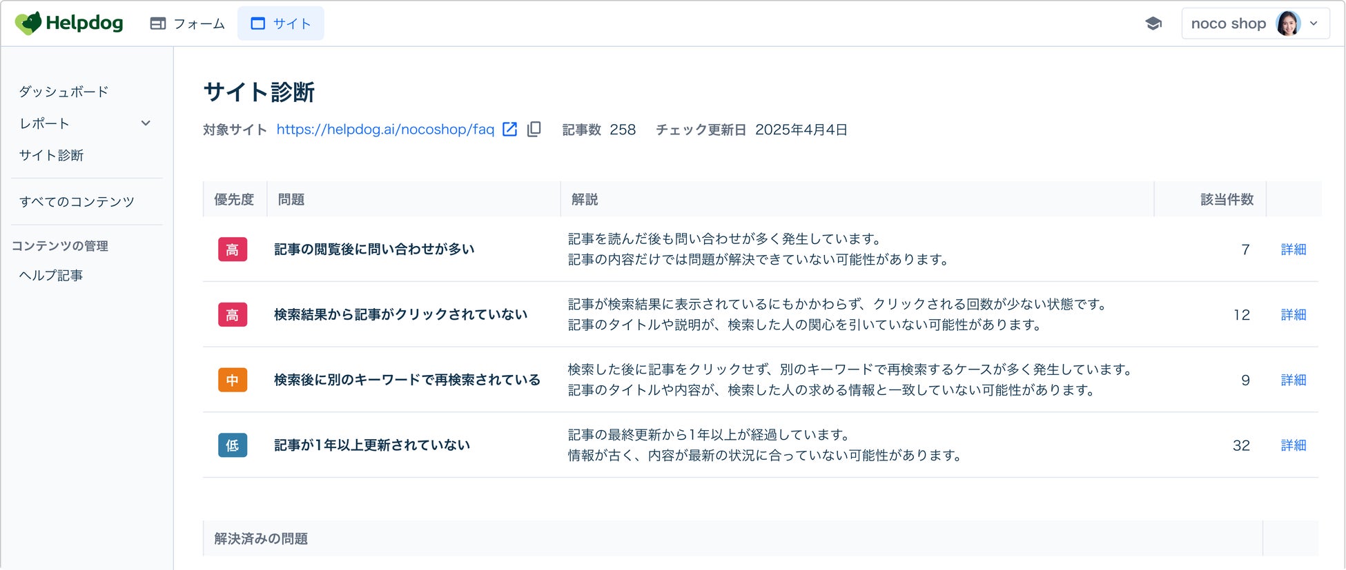 FAQは公開後の運用フェーズでの改善が不可欠ですが、多くの企業では「どのFAQが読まれていないか」「どの検索語が解決に至っていないか」といった分析が手間であり、放置されがちです。ヘルプドッグは、日々の検索ログや閲覧データをAIが自動で解析し、検索されたにも関わらず解決されなかったキーワードや、未整備のトピックなどを抽出します。さらに、改善の優先度を提示することで、現場担当者の作業効率を高めながら、コンテンツの継続的な最適化を支援します。