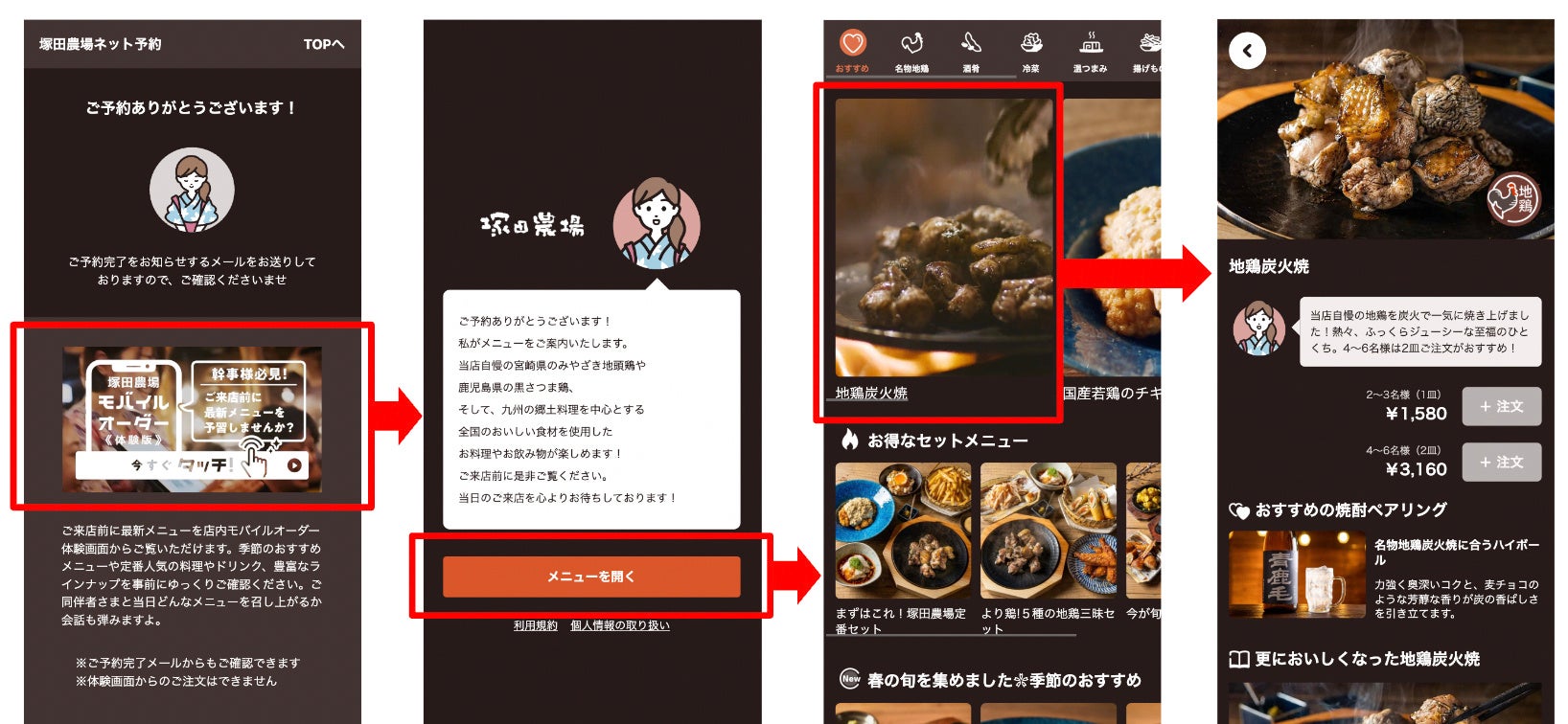 塚田農場の店内モバイルオーダー体験は、塚田農場ネット予約の予約完了画面などから、塚田農場で導入中の店内モバイルオーダー「トレタO/X(読み:トレタオーエックス)※」のデモ体験に遷移し、予約したお客様が来店前に塚田農場の世界観や詳細なメニュー情報に触れることできます。画像や動画を駆使したデモ体験で、来店前に期間限定メニューなどの注力したいメニューを効率よく周知できると同時に、塚田農場への期待を高めます。(※読み:トレタオーエックス)