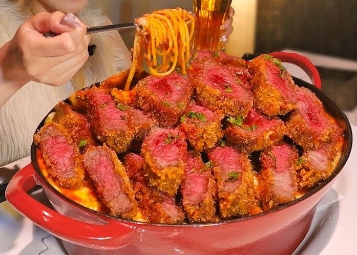 大食いYouTuberのためだけに開発された特別メニュー「デカ盛り牛レアカツのボルケーノパスタ」