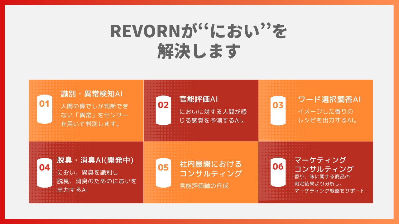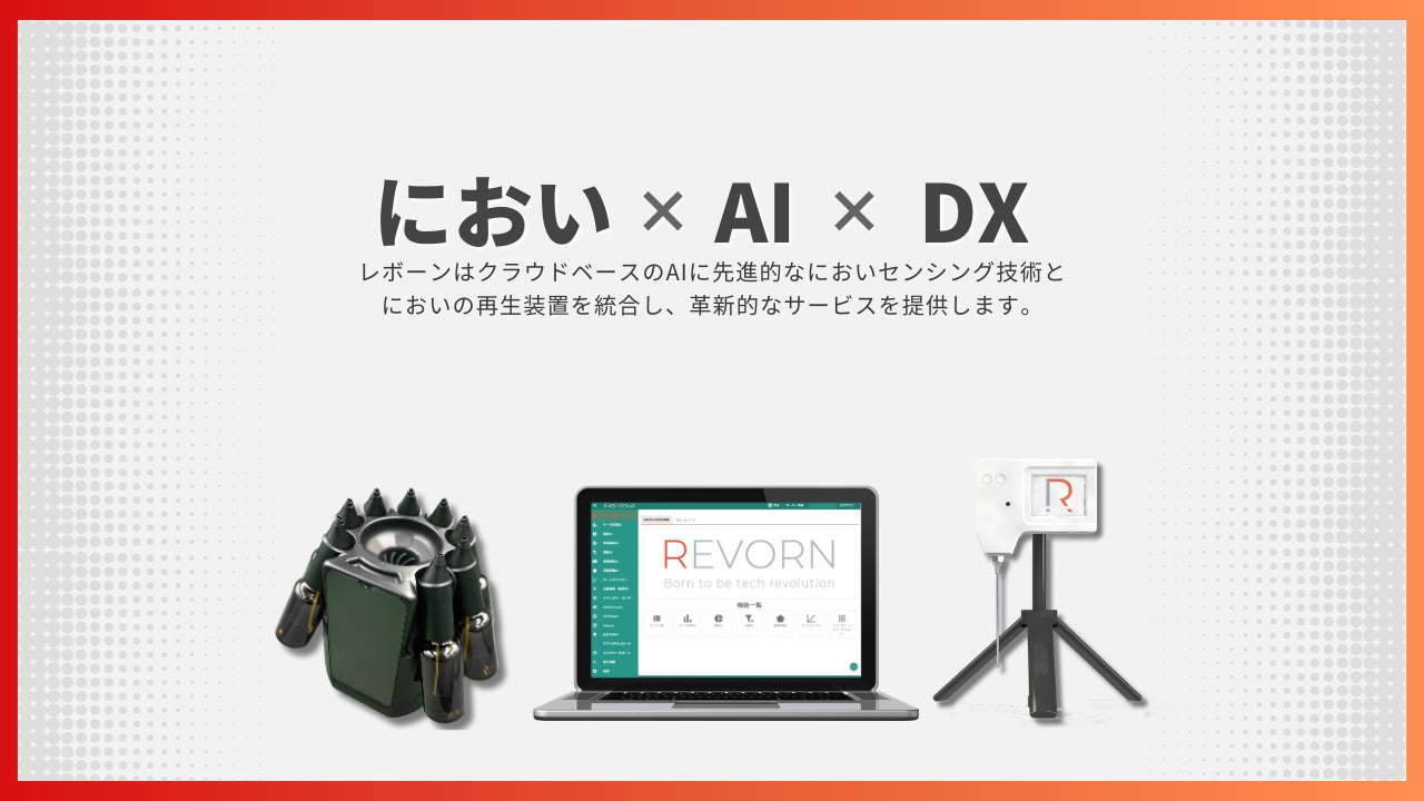 レボーンは、例えば食品メーカーにおいて、従来人の嗅覚によってのみ行われていた食品加工の生産ラインの官能評価試験を、独自開発のにおいセンサとAIをもって代替実施する実証実験を行い、工場導入を目指すなど、食品、環境、農業、医療などのさまざまなにおいに関する課題を解決するソリューションを提供しています。