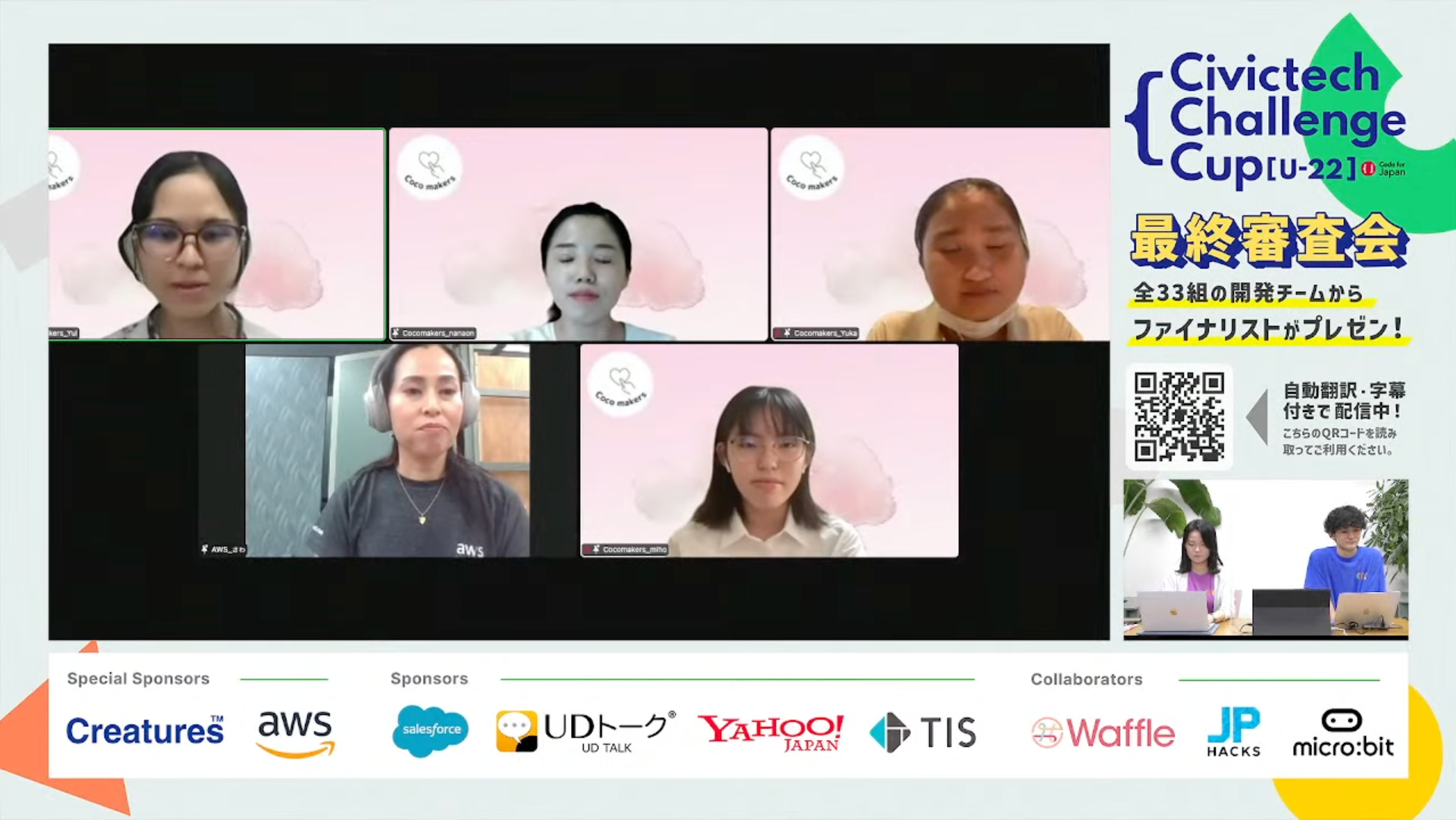 Civictech Challenge Cup U-22 (通称:CCC U-22) は3年目を迎え、累計450名の学生シビックハッカーを育成してきた、実践型デジタルシチズンシップ教育プログラムです。ゲストトークにパートナー企業のアマゾン ウェブ サービス ジャパン合同会社から澤扶美氏、協力団体の特定非営利活動法人Waffleから斎藤明日美氏をお招きし、プロトタイプ開発・サービス開発についての応援コメントをいただき、ファイナリスト8チームの発表と質疑応答、表彰を行いました。