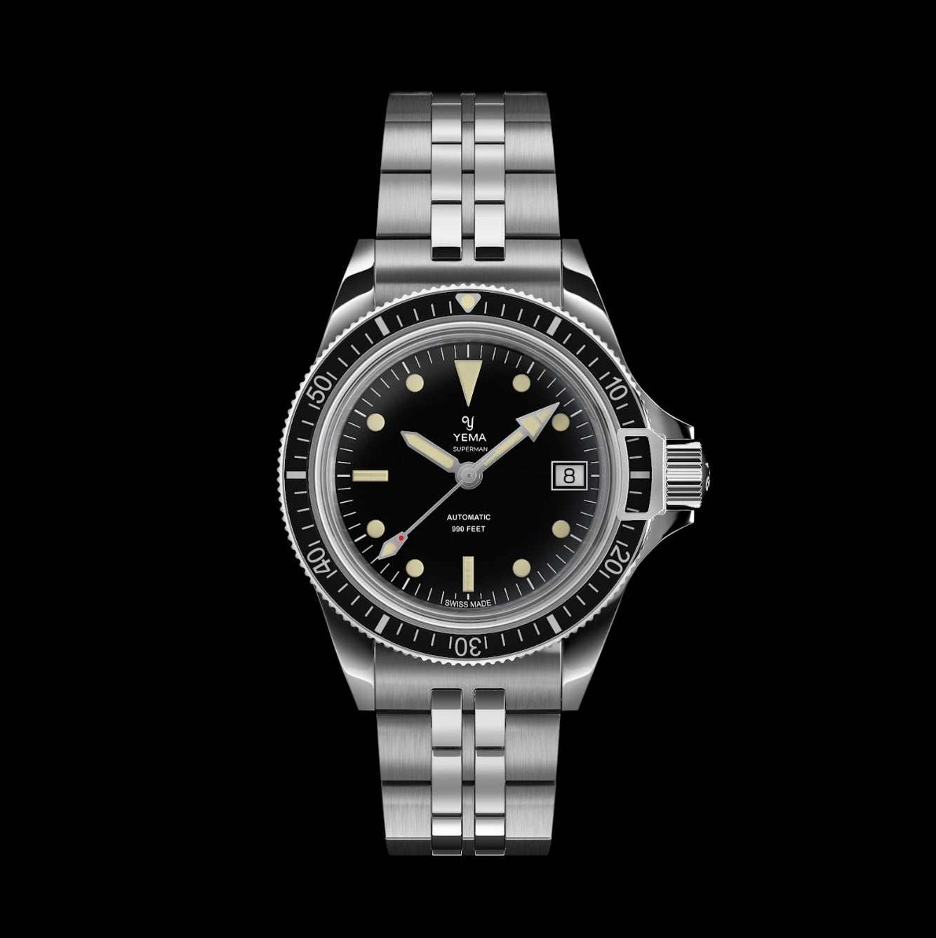 本モデルは、スーパーマンの象徴ともいえる 直線的なラグを持つステンレススチールケース や、YEMA独自の 特許取得済みのベゼルロック機構 を採用。これにより、ダイバーズウォッチとしての機能性と堅牢さを高めています。
