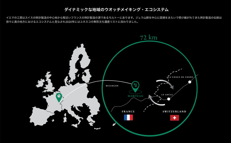 YEMAは、スイスとの国境近くフランス時計製造の発祥地モルトー(Morteau)に工房を構え、スイスの時計製造地域と密接に協力しながら、独自の時計づくりを進めています。