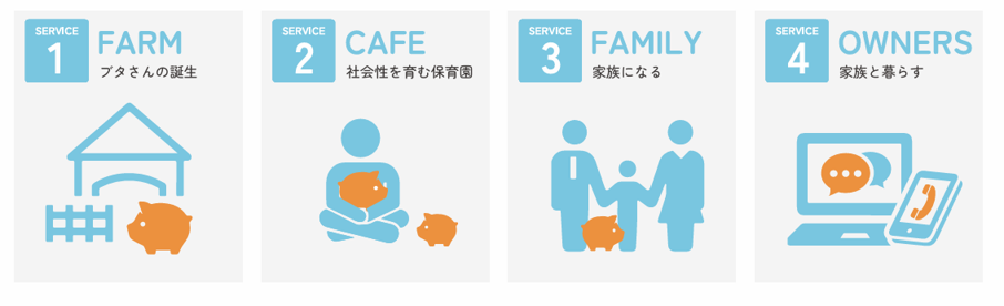 マイクロブタさんの誕生から、健やかな成長と日々の暮らしをサポートするサービス展開を行っています。