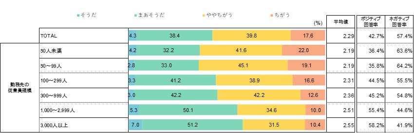 本調査ではDXの恩恵を業種別、従業員規模別に分析しています。図4は従業員規模別の回答分布を表していますが、「そうだ」「まあそうだ」を足したポジティブ回答率は従業員規模が大きくなるほど高まる傾向にあります。