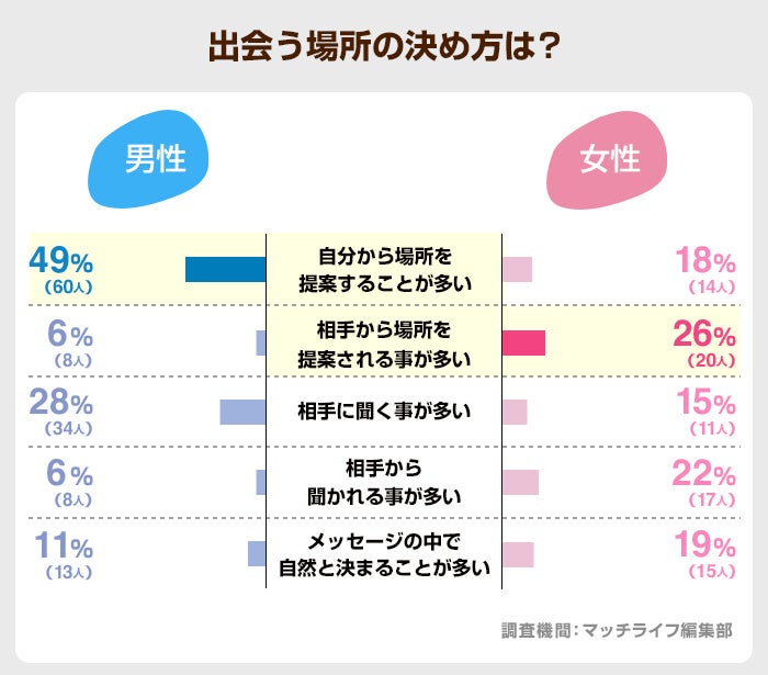 出会う場所は、49%の男性が自分から提案しています。相手の負担を減らすためにも選択肢を提示した上で相手と相談するのがおすすめです。