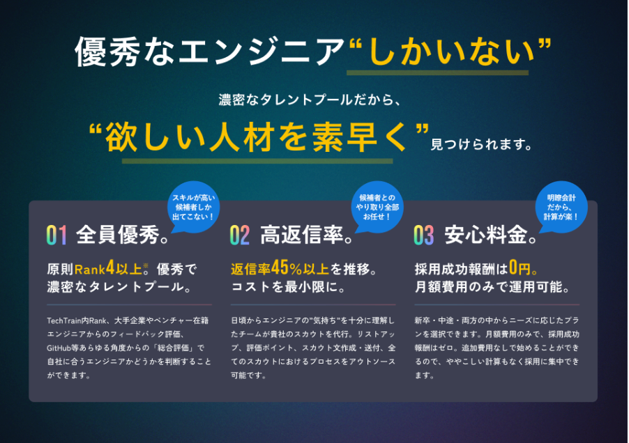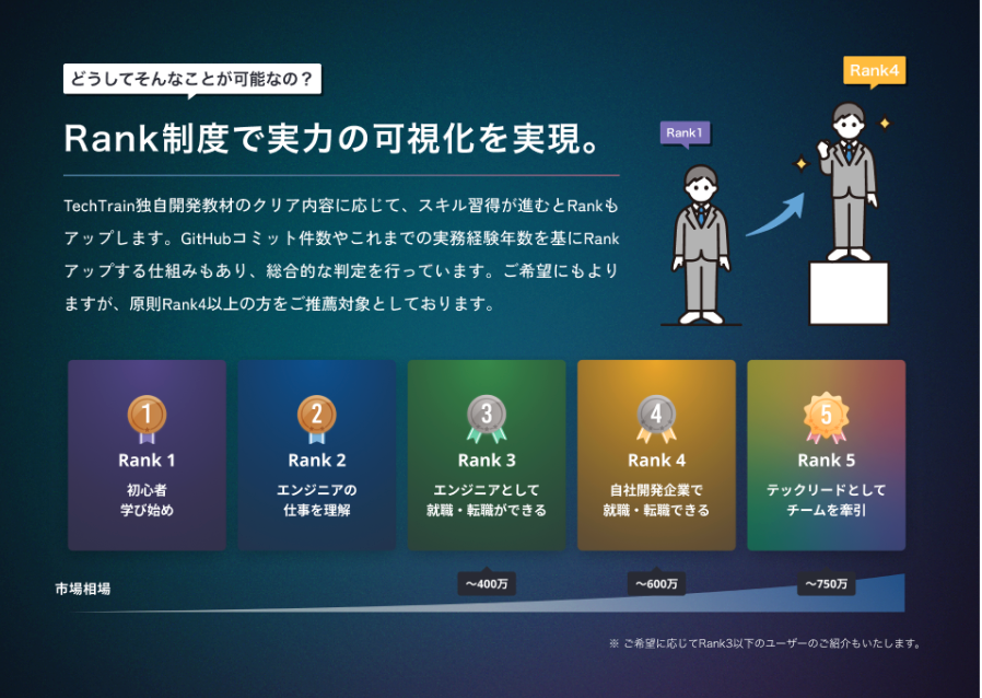 (※1)弊社エンジニア教育プラットフォーム「TechTrain」における5段階の独自評価「Rank」を基準としています。受託開発企業で内定獲得のできるRank3、自社開発企業で内定獲得のできるRank4、各社のテックリードを担えるRank5、これら3つのRankに該当するTechTrainユーザーのみを登録・利用対象としております。