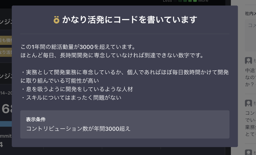 GitHubの情報から、そのエンジニアの活動の傾向やエンジニア同士の関係性など、そのエンジニアの魅力的なポイントを一般的な言葉で表現したキーワードを自動的に生成します。キーワードの定義は各タグをクリックすることで表示される詳細ダイアログに記載されていますので、スカウトメッセージ作成の参考にすることができます。