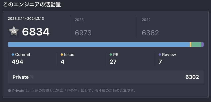 また、GitHubの情報から抽出した活動量を表示します。活動量は直近3年間で表示しており、長期的な技術力を捉えることができます。シンプルに数字が大きいほど、たくさんGitHubを活用し、多く活動していることがわかります。この数字は活動量の参考値ですので、おおまかな基準として利用するのがオススメです。DirecTrainが定める基準により、SS → S → A … といったバッジをつけていますので、候補者のピックアップに活用することができます。
