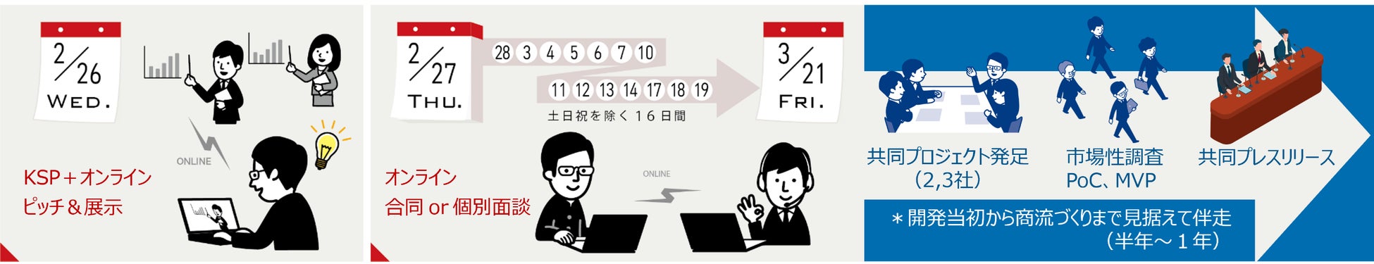 プロジェクトの発足に向けて、事業化テーマの発表やプロジェクトメンバー候補とのマッチングを行う本フォーラムでは、6社によるピッチとブース展示を行い、その後3週間かけてメンバー候補とオンライン面談を行います。全国の支援機関から推薦された中小・スタートアップ企業のほか、自薦での応募も可能です。