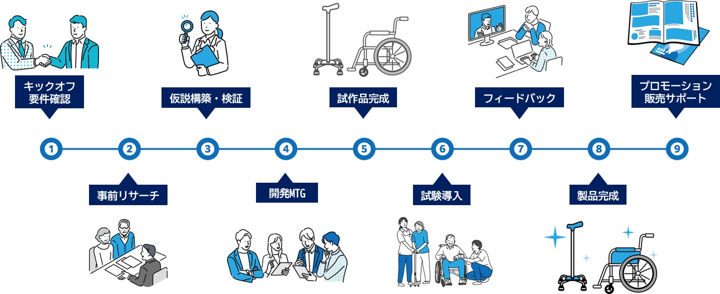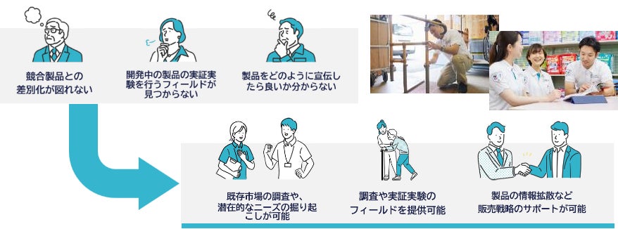 介護福祉事業を幅広く展開し、様々なフィールドを保持するては~とHDは、新商品開発を目指す事業者に対し、専門スタッフが有するノウハウの提供や、豊富なフィールドを活用し介護現場での実証実験を伴走サポートする「Care Solution Navi™」を2024年度より開始しました。利用者の状態や環境に合わせた用具を選定、提供する福祉用具専門相談員や福祉用具プランナーが、新商品開発の企画段階から試作開発、顧客現場でのモニタリング評価、さらには独自メディアでのプロモーションまでお手伝いし、事業化を強力に後押しします。