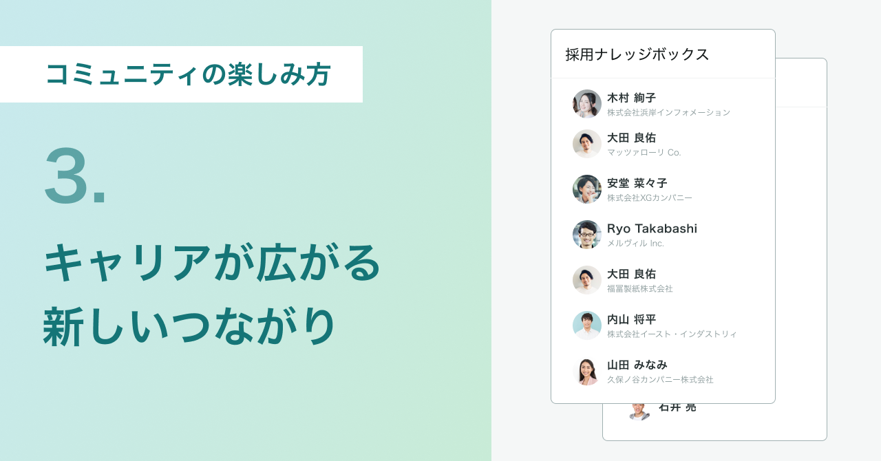 コミュニティを通じ、業界や職種、世代などの共通項をもつYOUTRUSTならではのつながりから、一人ひとりのキャリアが広がることを促進していきます。