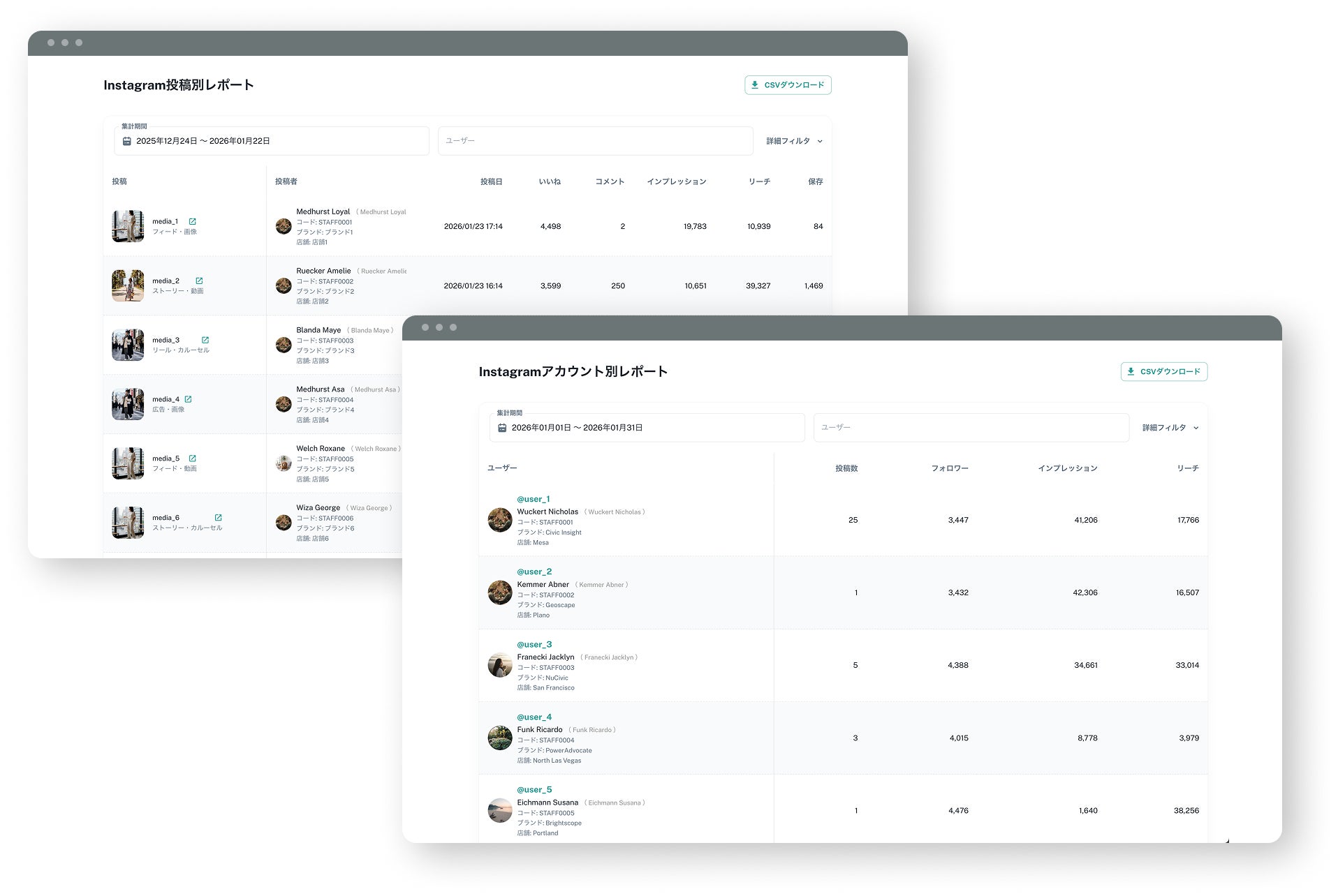 本機能により、企業はスタッフのInstagramアカウントをLEEEPと連携することで、全スタッフのSNS数値を管理画面上で一元的に確認・分析できるようになります。