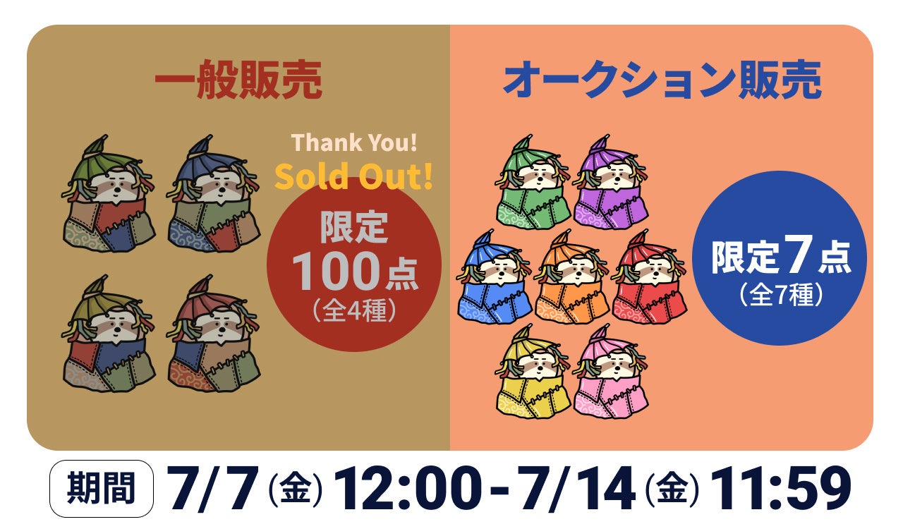 また、一般販売においてはNFT100点が当日完売、オークション販売においてはNFT7点が7月14日(金)11:59まで入札可能です。
