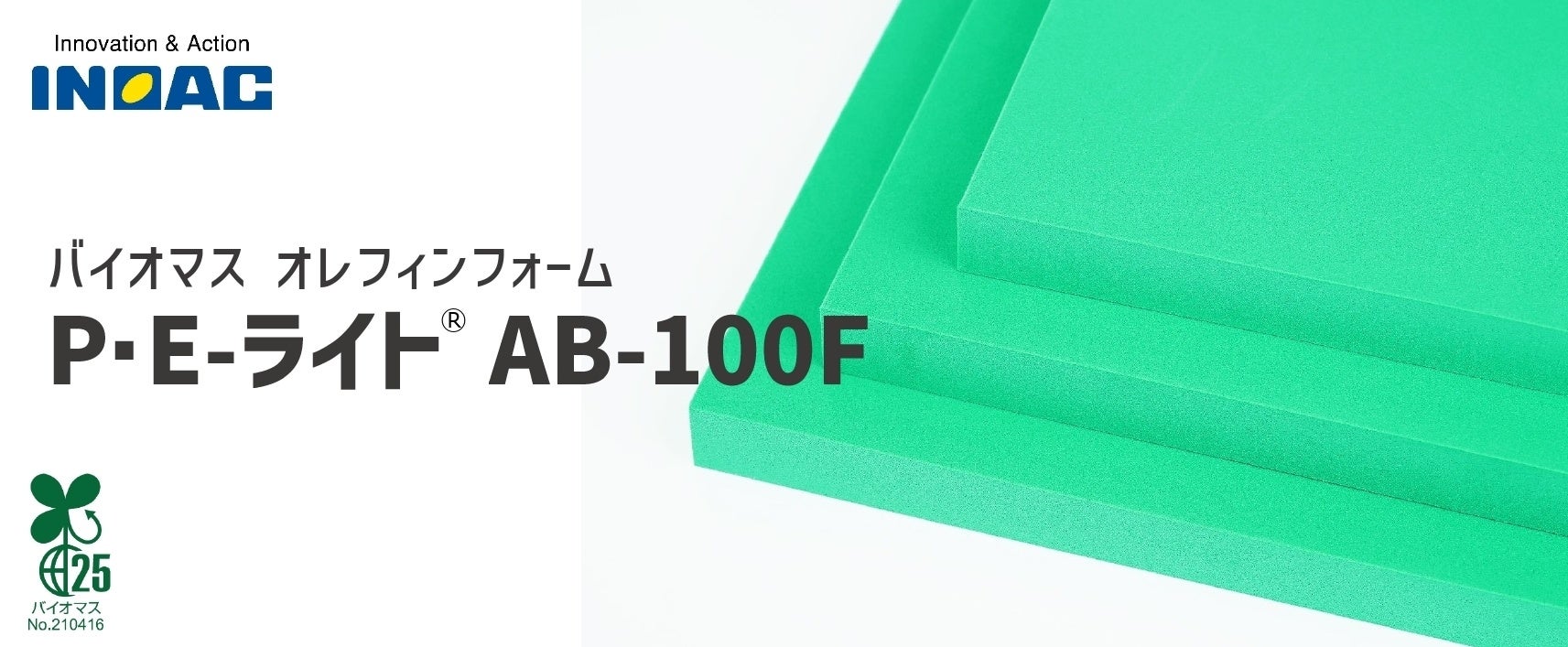 「P・E-ライト® AB-100F」は、生物由来原料を25%以上配合し、「バイオマスマーク(※)」を取得したイノアックの国産オレフィンフォームの名称です。