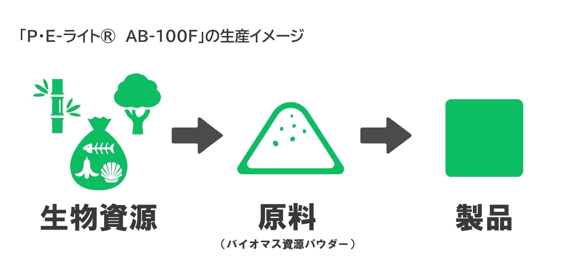 廃棄物となる生物資源から作られる「バイオマス資源パウダー」という原料を使用しつつ、石油由来原料品と同等の物性(8~15倍のポリエチレン発泡の硬度に近い物性)を維持することに成功しました。