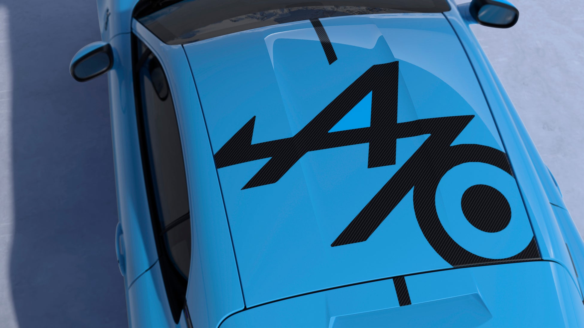 アルピーヌ A110 R 70 BLEU BLANC ROUGEは、装着されているカーボンパーツのうちボンネット、ルーフ、リアフードがボディ同色にペイントされ、ルーフには70周年ロゴがデザインされています。このロゴは、ルーフをペイントする際にロゴの部分はペイントせずにカーボン地を残すことで描かれています。