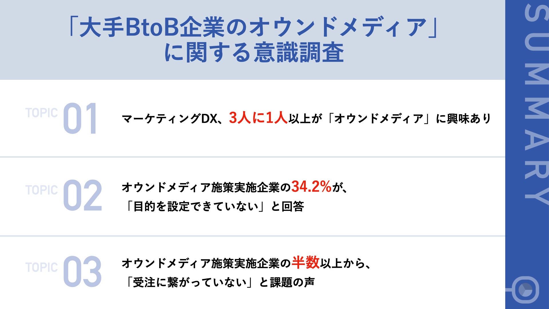 今回の調査では、大手BtoB企業の7割が、オウンドメディア施策に既に取り組んでいるものの、多くの企業が「受注に繋がっていない」と考えていることが判明しました。そもそもの「明確な目的」を設定せずにオウンドメディア施策を開始してしまい、運用のゴールが不明確になっていることが効果の実感に結びついていない要因の1つのようです。