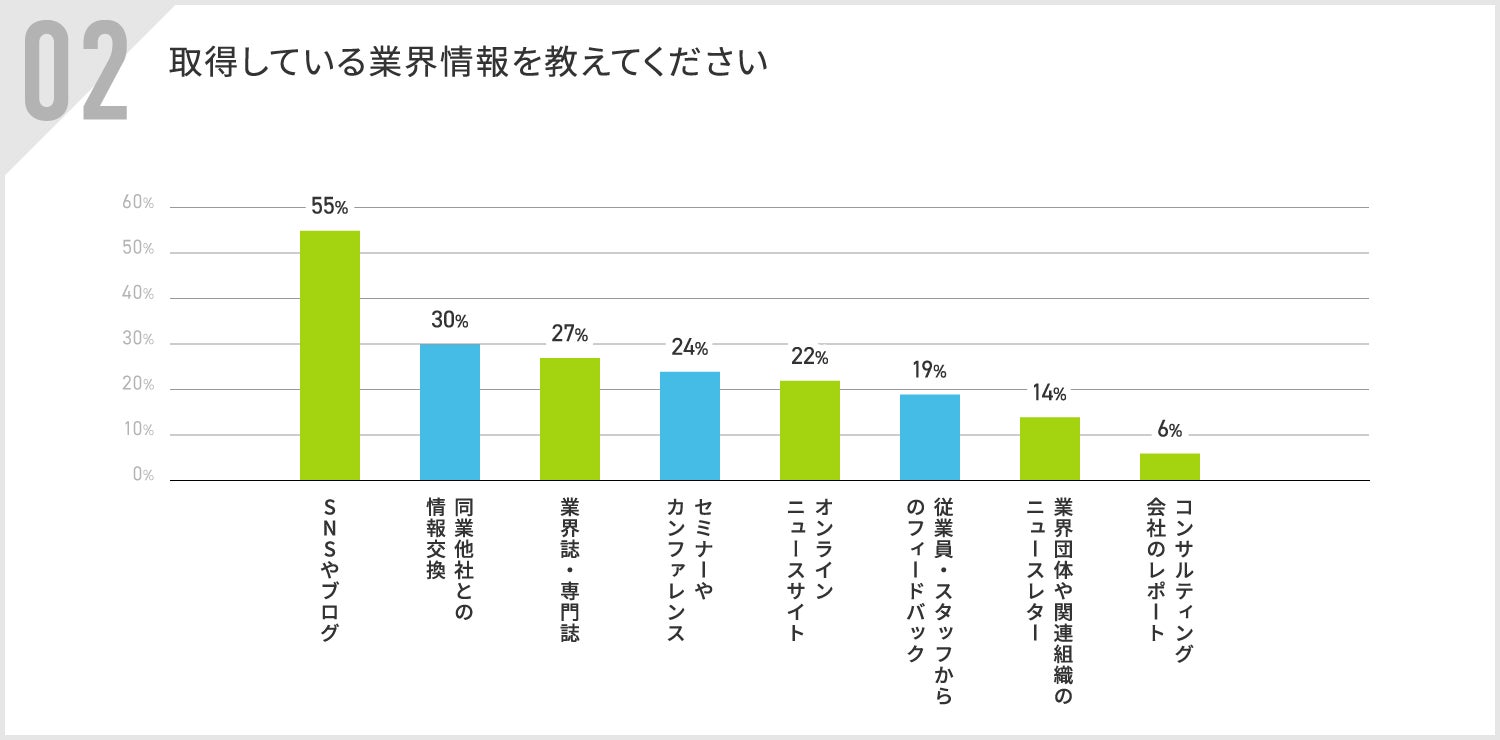 業界情報の取得方法は「SNSやブログ」が55%と最も多い結果となりました。次点は「同業他社との情報交換」が30%、「業界紙・専門誌」が27%と続きます。