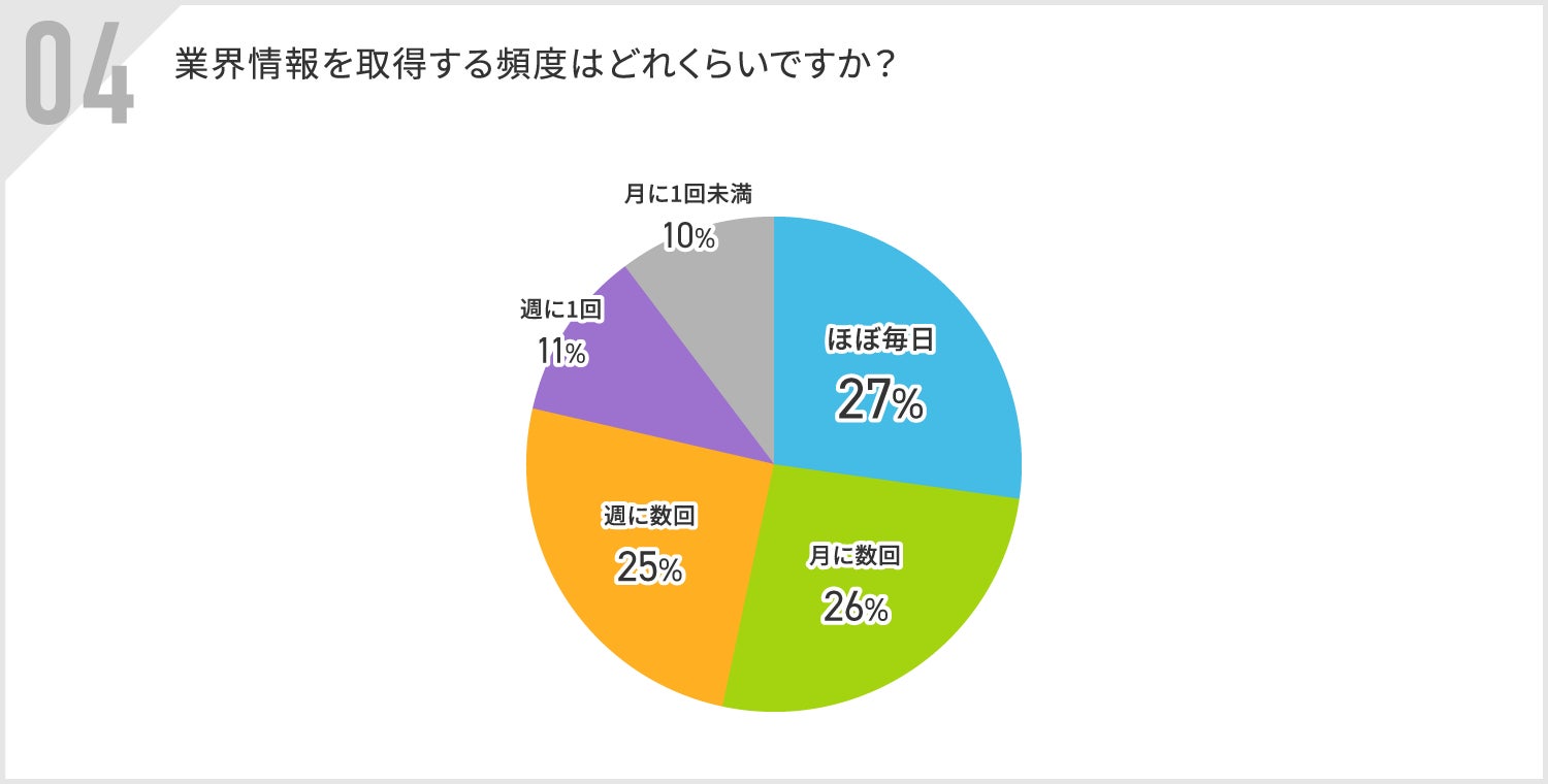 業界情報をどのくらいの頻度で取得するか、という問いには「ほぼ毎日」と答えた方が27%で最多でしたが、「月に数回」、「週に数回」と答えた方もほぼ同じ割合の結果となりました。「週に1回」「月に1回未満」と答えた方は約10%と少ない傾向にありました。