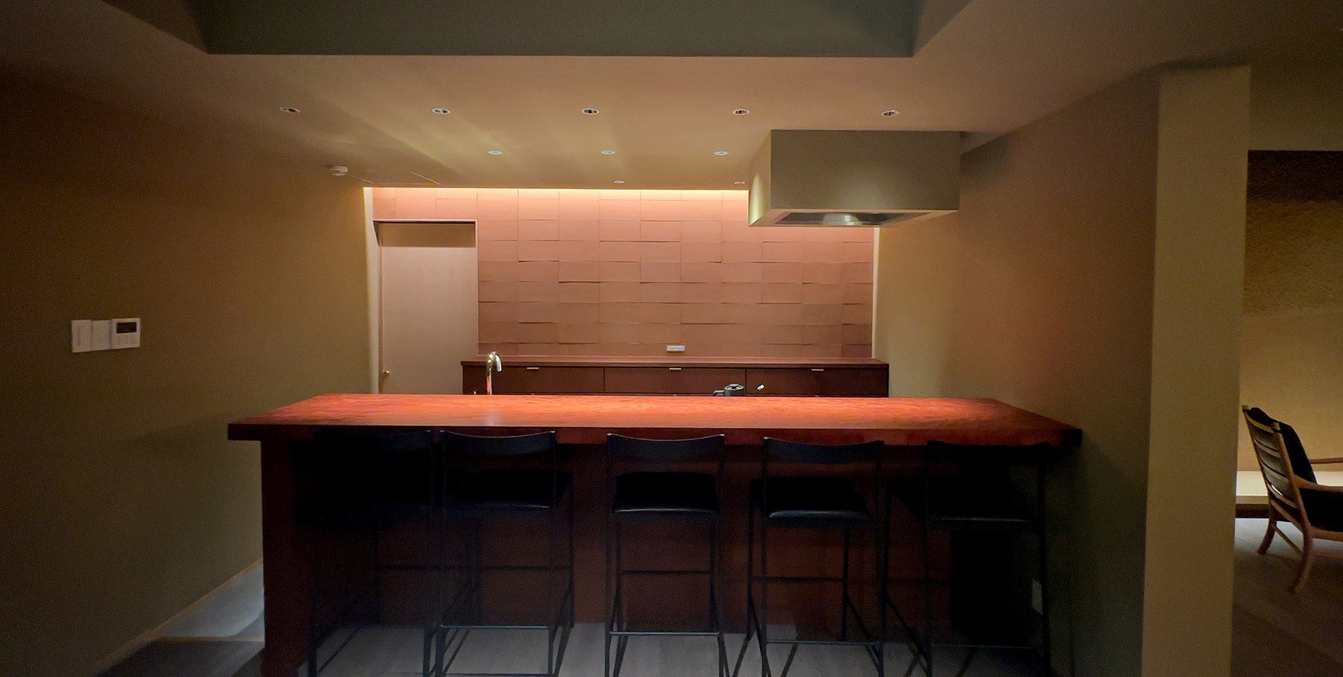 自然豊かな淡路島の風景、鳴門海峡と島の隆起に大地の躍動を感じ、人の動作との同時性を荒々しさと穏やかさの表情で表現。日々の光の移ろいが、室内に自然の変化を呼び込むことで表情を変えていきます。