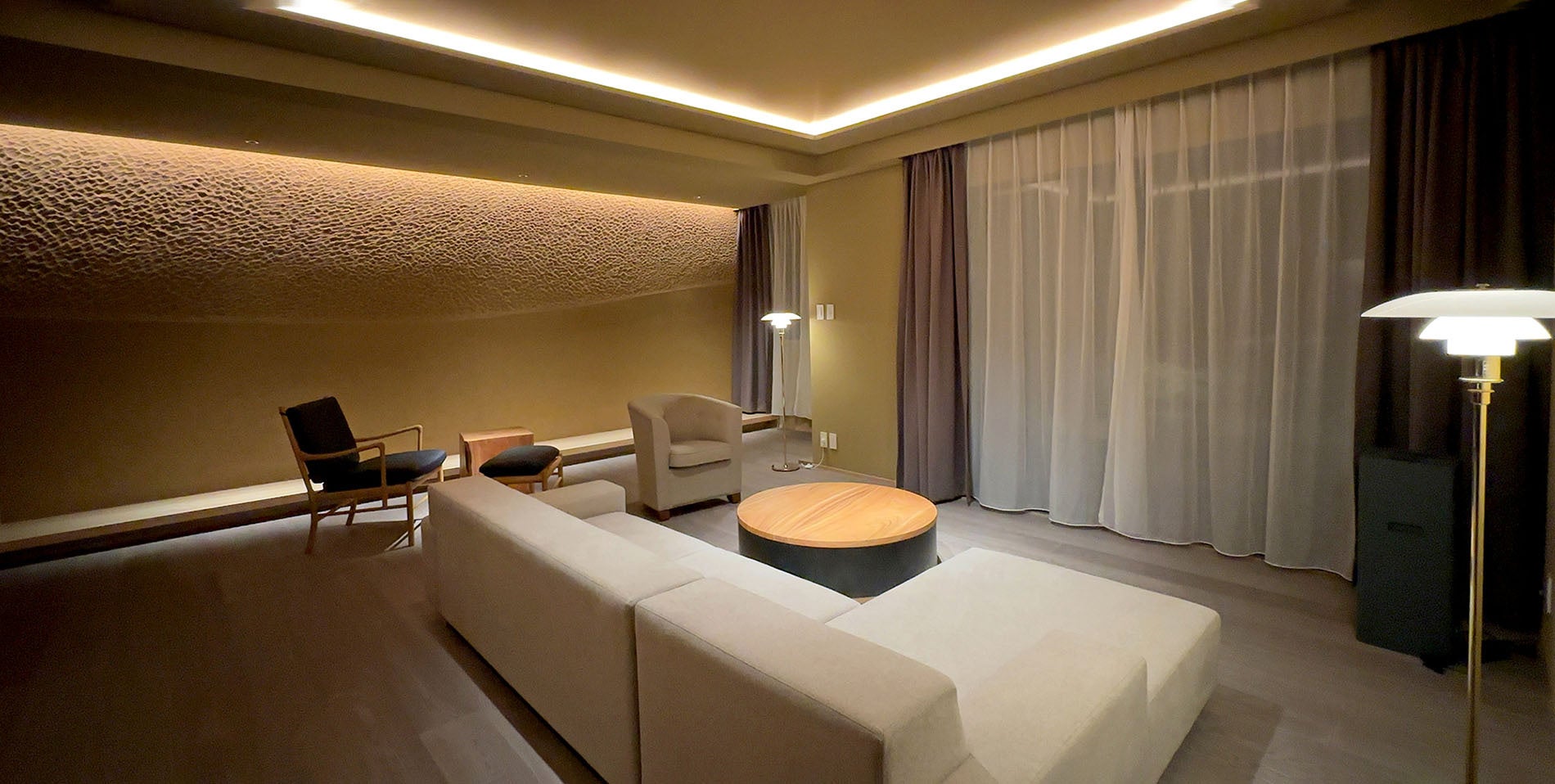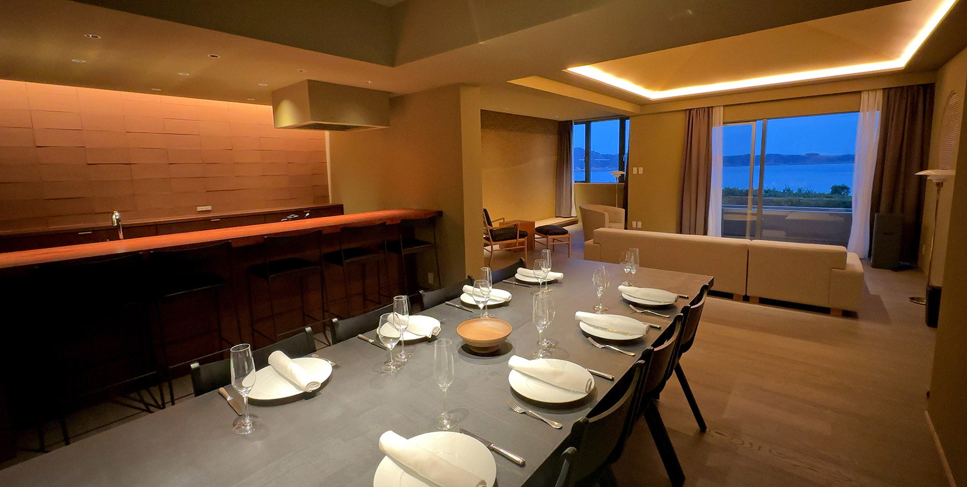 最後に室内の家具にもこだわりが詰まっており淡路島の楠無垢材を使用したサイドテーブルをはじめ、ハタノワタル氏の和紙で貼り仕上げたダイニングテーブルなど、細部に至るまでこだわり抜いた家具で、上質な空間を演出しています。ヘリテージオーシャンスイートは、最高級のくつろぎと贅沢をお求めの皆様に、至福のひとときをお約束いたします。是非、この特別な空間で非日常の体験をお楽しみください。
