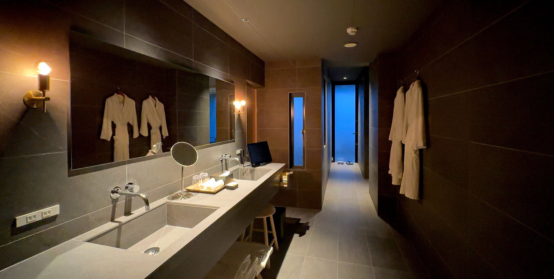 そしてご滞在いただく客室の照明にはモデュレックス社製の最新テクノロジーを採用し、WELCOME、NIGHT、BAR-hoshi、MORNINGからなる4つのシーンに合わせた演出を実現。ご滞在中それぞれのシーンに合わせた心地よい照明がお客様をお迎えします。アメニティで特筆すべきは本場静岡のお茶に加え、ホテル内で自生したローズマリーを採取し使用した「飲み比べお茶セット」をご用意。また浴室にはヒノキのかんなくずを使用した「ヒノキリボン」も提供され、ヒノキの香りを楽しみながら心身ともに癒しを求める方々に最適なアメニティを準備。また何と言ってもヘリテージオーシャンスイートの浴室から眺める大鳴門橋は、まるで1枚の絵画のような美しい景観をお楽しみいただけます。