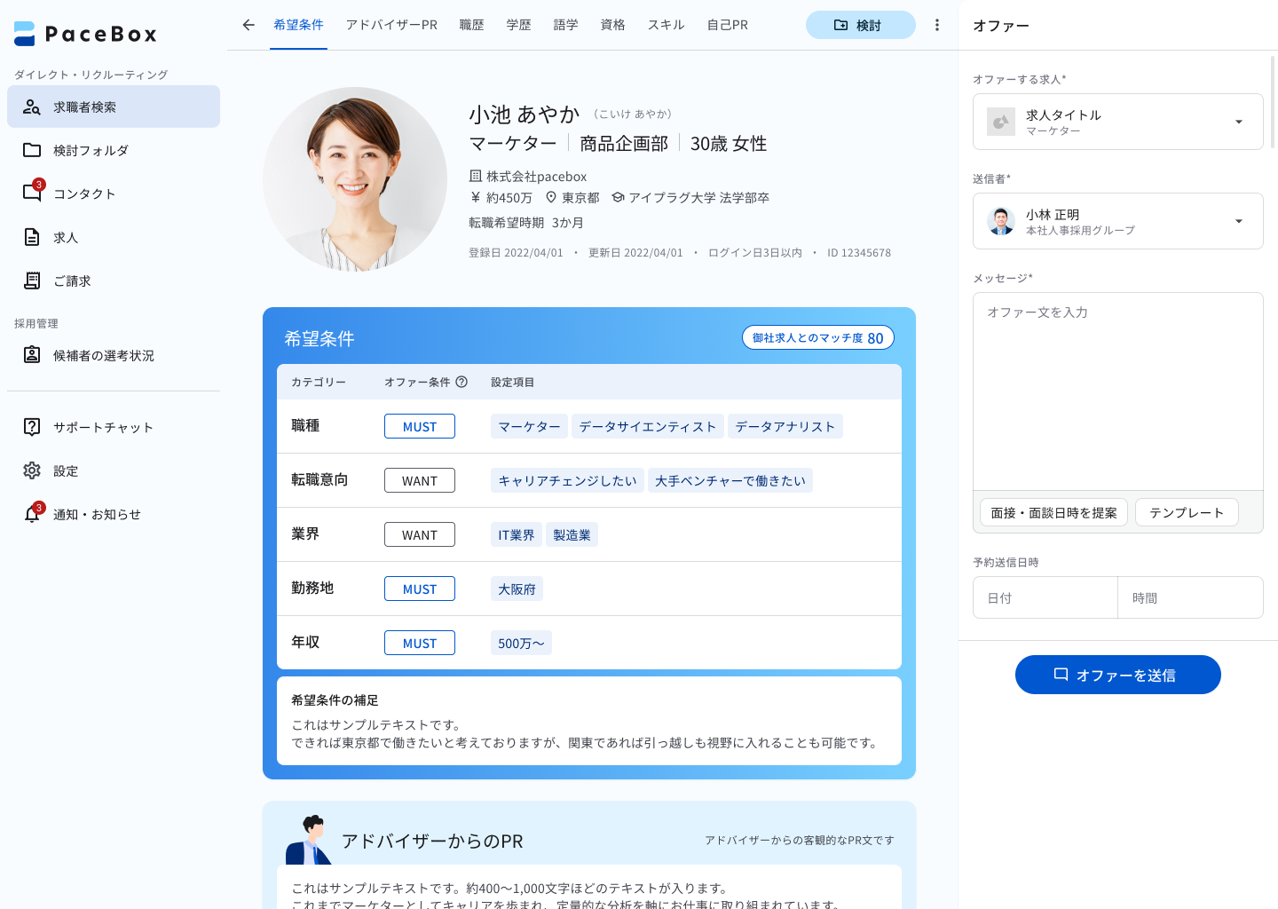 PaceBoxでは、希望年収や志望勤務地などの条件を細かく設定し、自分の条件に合うオファーのみを受け取ることができます。これにより以下のメリットを求職者に提供します。