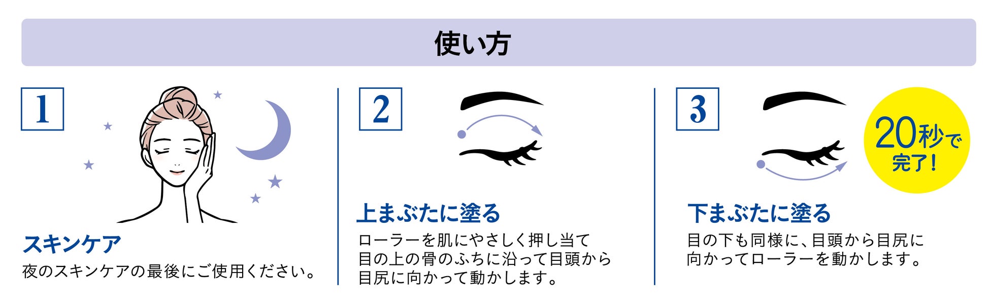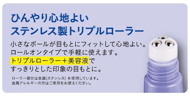 まぶたをスッキリとひきしめる、夜用目もと美容液。ステンレス製トリプルローラーと9種類の成分でまぶたや目元にアプローチします。