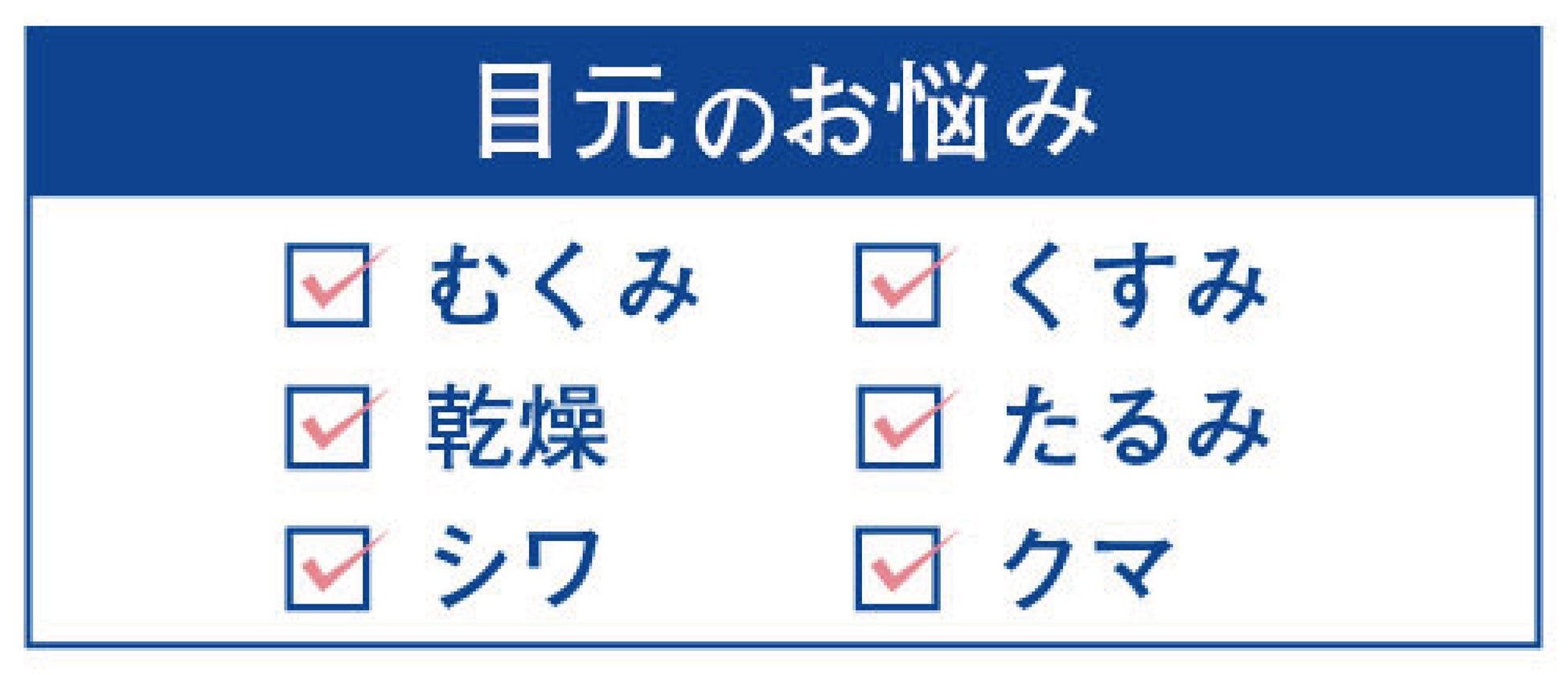 第一印象で大切と言われる、表情や姿勢などの見た目。その中でも特に印象が強いのが“目元”です。目元は、見た目の第一印象の8割を占めるとも言われています。目元に対する悩みの種類はむくみ、クマ、シワ、たるみ等と多いものの、ケアをできていない人が多いことも特徴です。