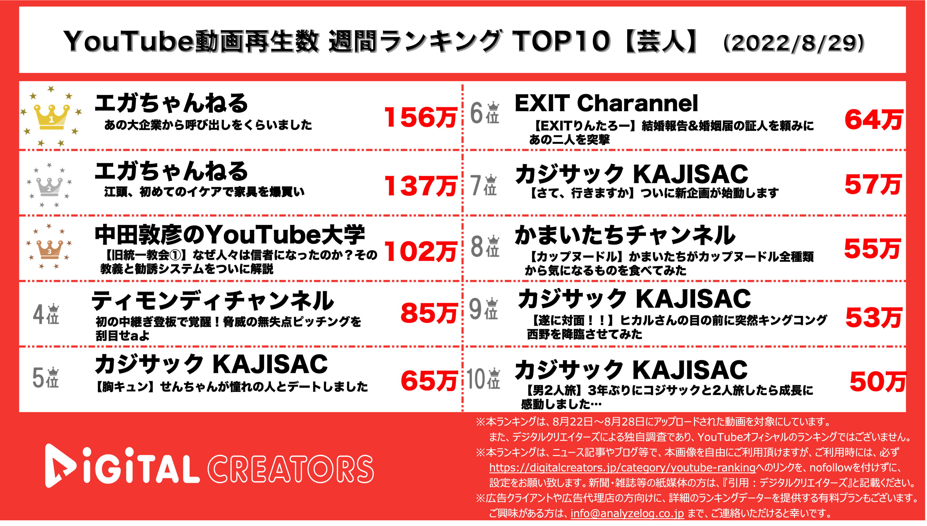 8月22日(月)〜8月28日(日)に公開された動画の、芸人チャンネルランキングTOP10を発表。