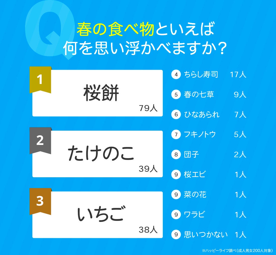 次に「春の食べ物といえば何を思い浮かべますか?」と聞いたところ、1位〜3位は以下のような結果となりました。