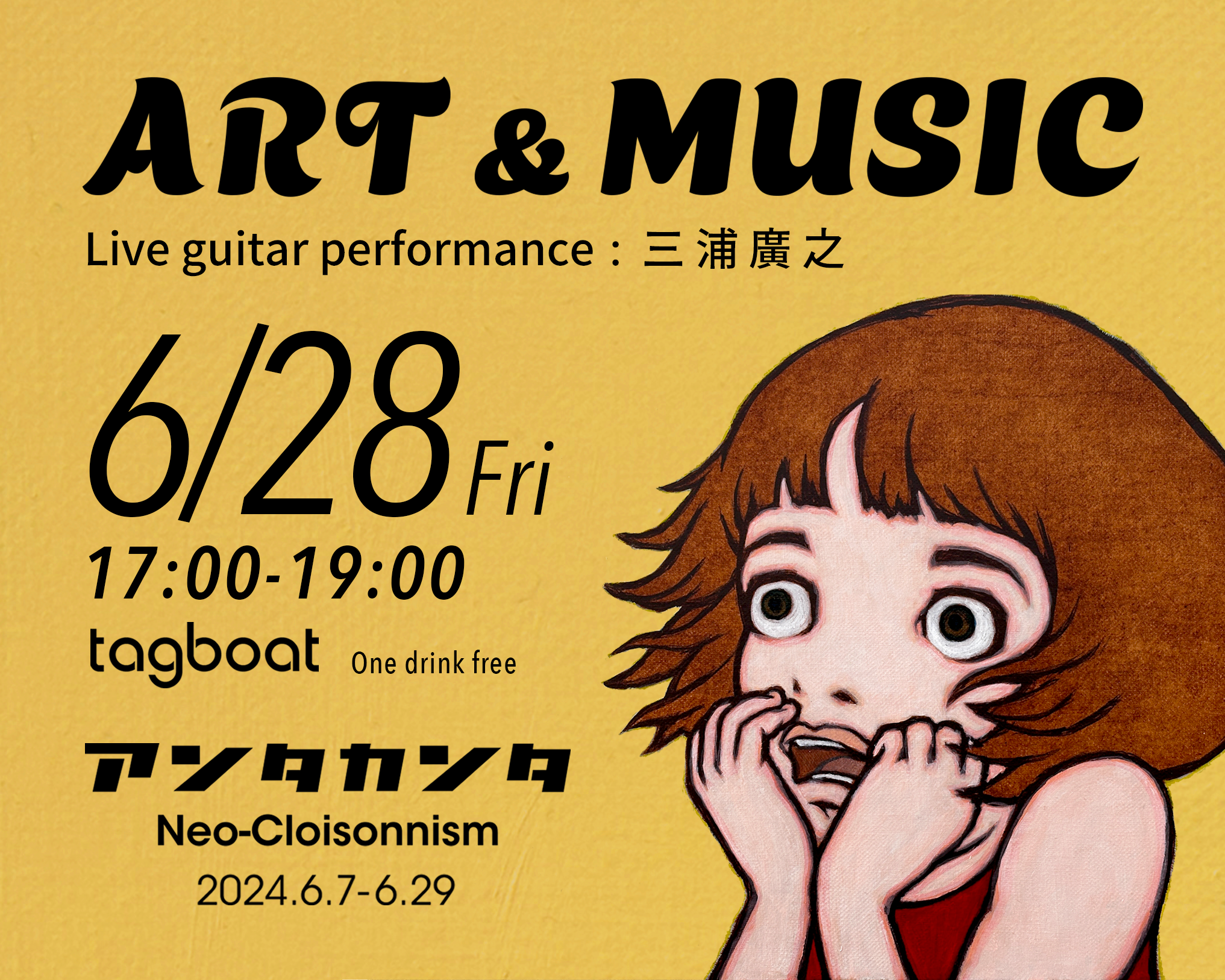 6月28日(金)には「Art & Music」を開催予定。ギタリストの三浦廣之氏を迎え、ソロギターパフォーマンスと共に作品鑑賞をお楽しみいただけます。じっくりと生演奏を堪能するもよし、音楽に耳を傾けながら会場を歩いて作品の世界観に浸るもよし、過ごし方はあなた次第。会場ではドリンクもご用意しておりますので、是非皆さまお誘いあわせのうえお越しくださいませ。