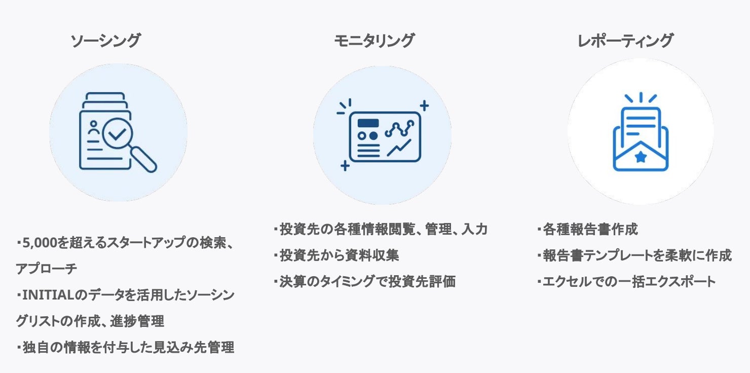 投資家向けには、案件ソーシング、投資先管理、ファンド管理、LP向けレポート作成支援などの投資関連業務を効率化するサービスを包括的に提供しています。スタートアップ向けには同じプラットフォーム上で、株主総会、資本政策、ストックオプション管理などのサービスを提供しています。