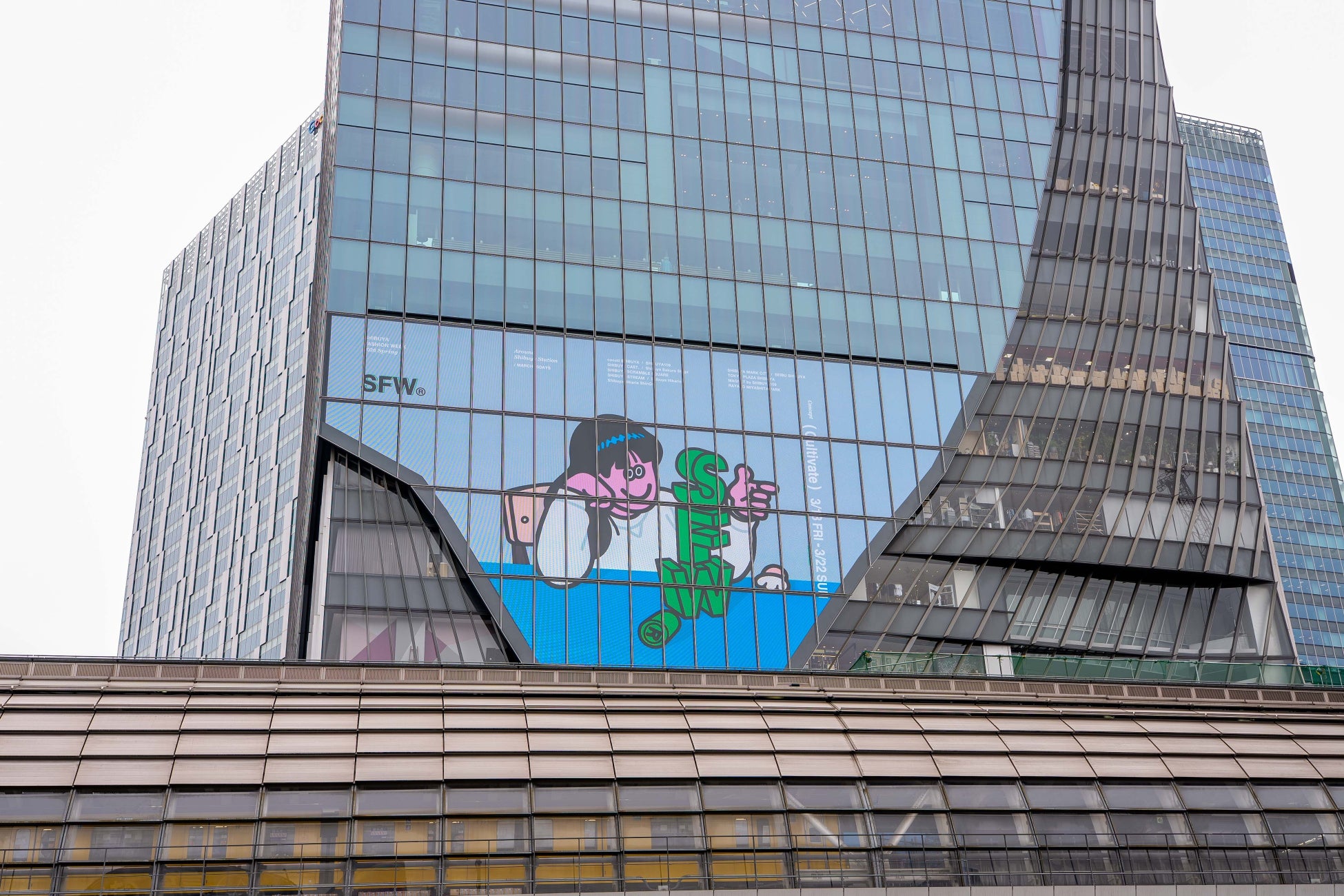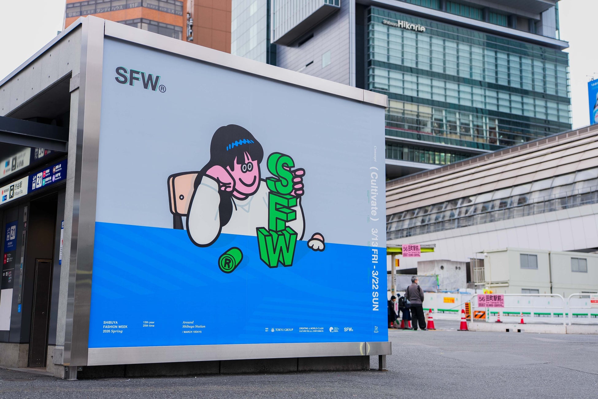 会期中、Face Okaさんによって渋谷ファッションウィークのために描き下ろしされた期間限定のアートが、渋谷の街の至るところに登場。「渋谷駅出入口21番エレベーター地上上屋壁面」には大型アートも出現、渋谷の街を彩り来街者をお迎えします。