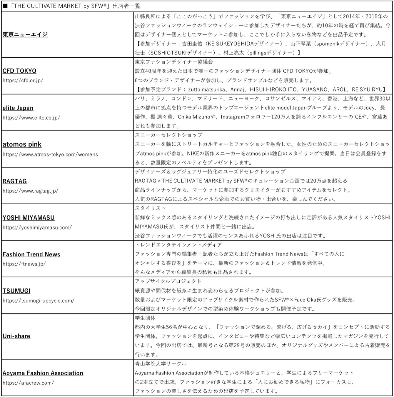 今春の新しい試みの1つとして、渋谷ファッションウィークとして初となるマーケット「THE CULTIVATE MARKET by SFW®」を渋谷サクラステージで開催します。「コミュニティを交ぜる」というこの新しいマーケットには、渋谷ファッションウィークがこれまでの13年の歴史で積み重ねてきたネットワークをベースに、ファッションデザイナーやインフルエンサー、スタイリスト、ブランド、学生サークルなど、ファッションを中心とした多彩な顔ぶれが出店予定。SNSでの情報発信にもご注目ください。