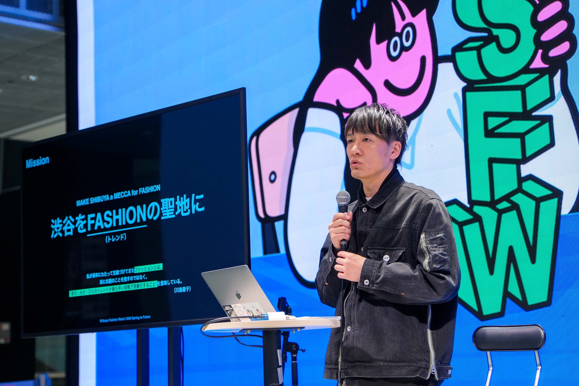 渋谷ファッションウィークを代表して事務局長寄本健からご挨拶の後、大規模再開発で変わりゆく渋谷の街を舞台にした渋谷ファッションウィークのクリエイティブディレクターである田中ヒロと、キービジュアルを担当したFace Okaさんから、それぞれの立場ならではのクロストークを発信しました。
