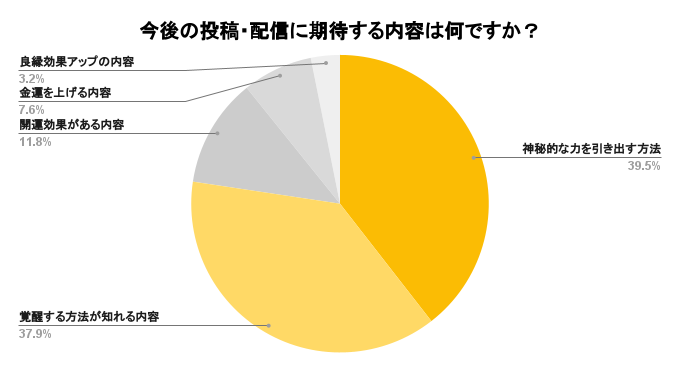 「今後の投稿・配信内容の希望を教えてください」との質問に対して・神秘的な力を引き出す方法(39.5%)・覚醒する方法が知れる内容(37.9%)など8割近くが「目に見えないエネルギー」を高める方法を知りたいと回答。物質的な豊かさである「金運・良縁」はそれぞれ6%・5%と少ない結果でした。物やお金などの「目に見えるもの」よりも、精神・人間性などの「目に見えないもの」に価値を見出す人が増え、風の時代の新しい価値観を象徴する結果でした。