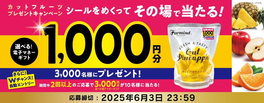青果の総合流通企業の株式会社ファーマインド(本社:東京都千代田区、代表取締役社長兼COO:小林 格)は、2025年4月1日(火)より、選べる電子マネーギフトが当たる『カットフルーツキャンペーン』を実施いたします。