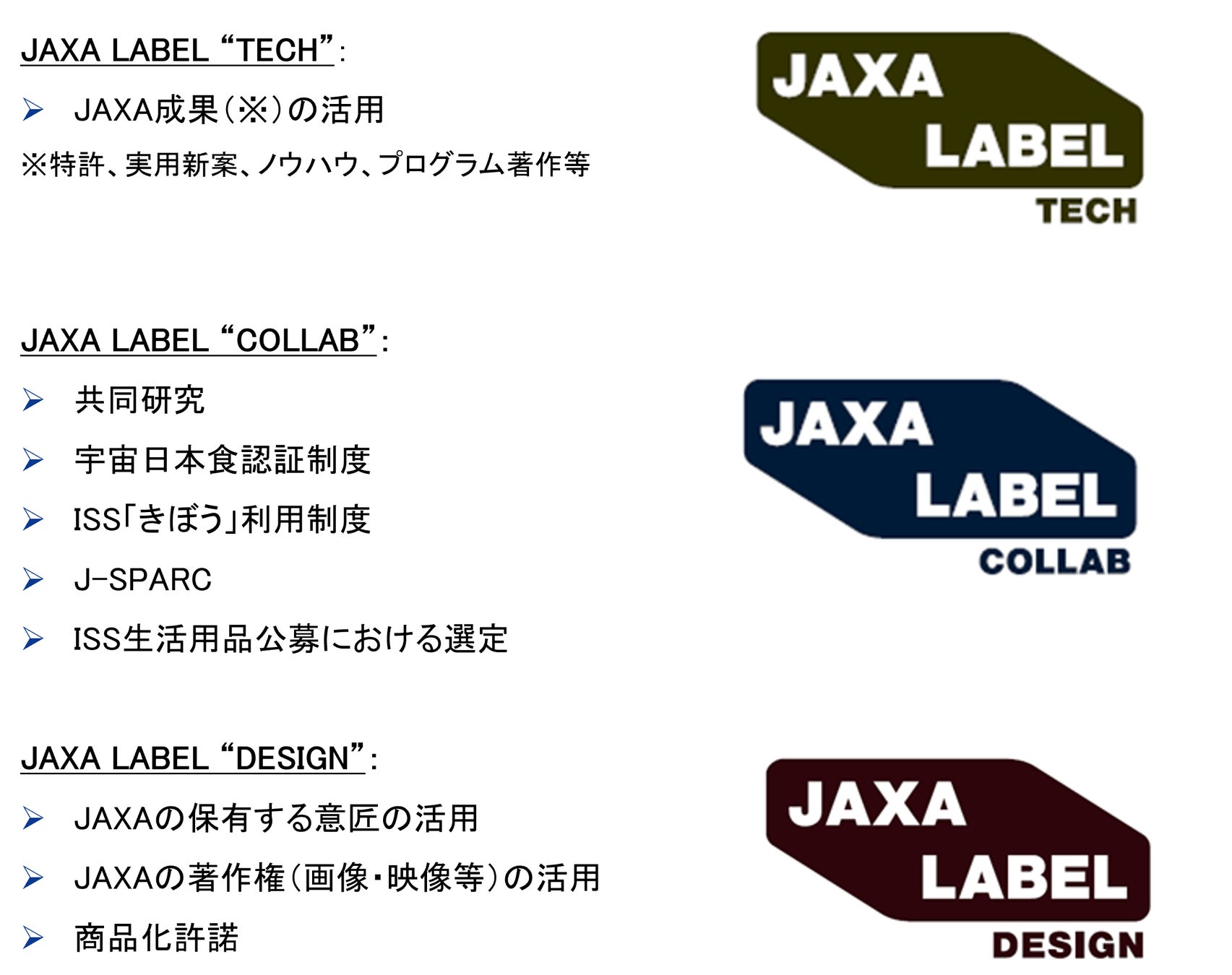 「JAXA LABEL」は、付与対象商品の種類に応じて、3種類の異なるロゴマークを付与いたします。