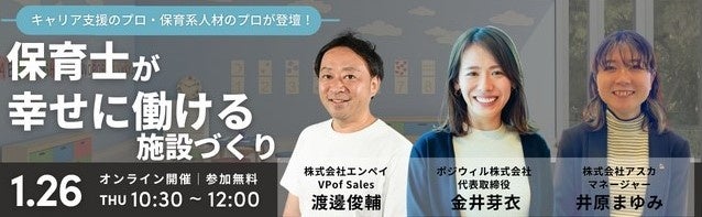本ウェビナーでは、ポジウィル株式会社代表取締役の金井様とともに弊社、東京支店副支店長の井原が登壇し、保育士のキャリア形成という観点から、保育士が幸せに働ける施設づくりについてお話をさせて頂きます。