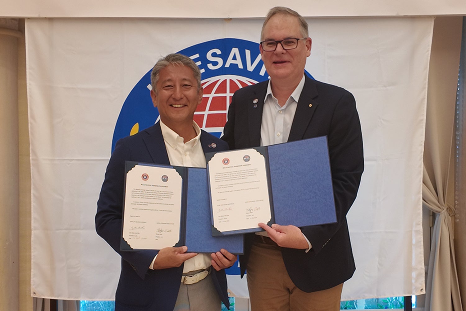 公益財団法人日本ライフセービング協会(東京都港区 理事長 入谷拓哉:以下、JLA)は、2024年10月12日(土)から14日(月)に開催された「第50回全日本ライフセービング選手権大会」へ、サーフ ライフセービング オーストラリア(以下、SLSA) 会長で国際ライフセービング連盟(以下、ILS)アジア太平洋地区 会長の ジョン・ベイカー AM , EMS を招聘し、2007年から結んでいる水辺の事故防止における戦略的パートナーシップ協定の継続を確認するための調印式を執り行いました。さらに日本に初めてライフセービングを指導した、SLSAライフメンバーの ワレン・レイニー AM 、そして元SLSA会長のロン・ランキン AM にも来日いただき、1983年以来、豪日交流基金がもたらしたライフセービング交流プログラムが継承されていることを実際に見ていただきました。