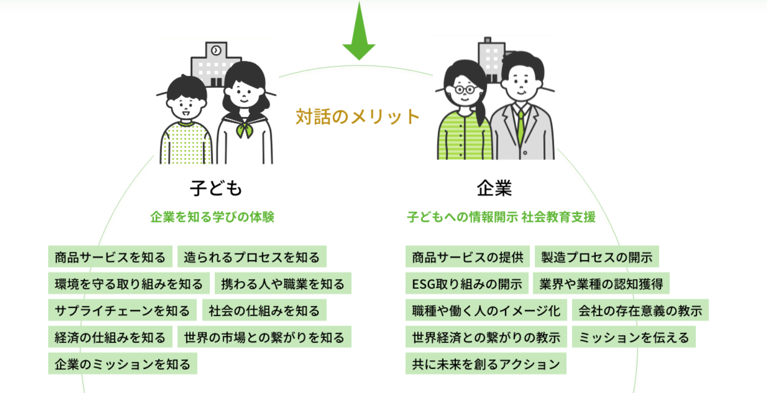 私たちは、特にESGにおける(S:ソーシャル)の取組推進と情報開示を、お子様向けの会社紹介、職業体験として提供することで、企業の皆さまの非財務評価の向上と経済成長に貢献したいと考え、行動しております。日本と世界の経済を支え、素晴らしい事業やサービスを手掛けている企業は数多くあり、私たちは企業と、子どもを結ぶ架け橋になりたいと考えています。企業の皆様からお子さま向けに会社情報の開示や、職業体験などの機会を提供することで、子どもは将来、社会で働くことのビジョンを学童期・思春期から描くことができます。