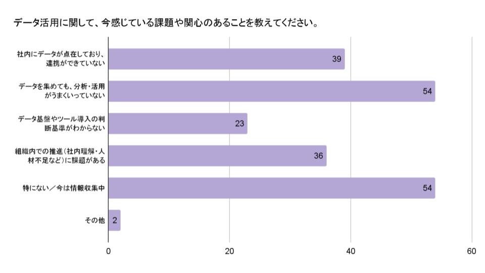 さらに、「データ生成の仕組みへの関心」(16.6%)や「将来的な業務連携・協業のヒントを得たい」(12.5%)といった回答からも、今後の事業成長に向けたデータ戦略を模索する企業の姿勢が垣間見えました。