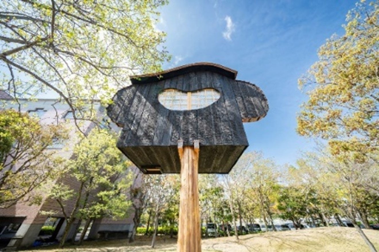 約1年半の制作期間をかけて完成した『空飛ぶ茶室』は、地上からの高さが5.7メートル、千利休由来の3畳茶室にこだわり、柱の上に佇む丸みを帯びた茶室モニュメント。デザイン美術学科の学生らが、焼杉造りや内部の装飾デザインにも藤森氏とともに携わりました。