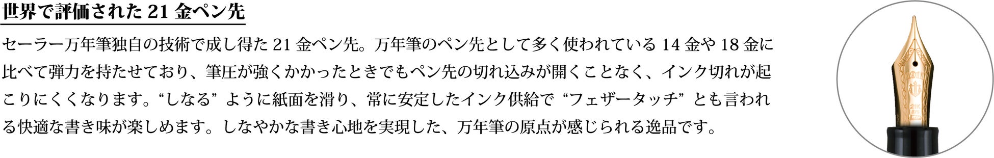 その本体に世界で評価された、セーラー万年筆独自の大型21 金ペン先を搭載いたしました。受注生産により、用途やシーンに合わせてお好みの字幅を全7 種からお選びいただけます。