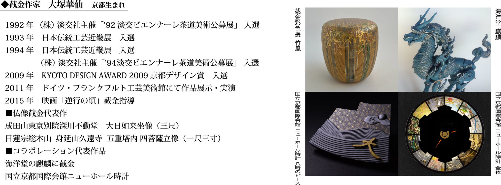 截金は、6 世紀、仏教とともに伝来した、金箔・プラチナ箔などを数枚焼き合わせ細く直線状に切ったものを、筆と接着剤(にかわ)を用いて貼ることによって文様を表現する伝統技法です。それが仏教美術の飾り立てる技として発展し、今日では日本でのみ京都を中心に継承されています。現在は仏教美術の枠を超え、芸術、工芸、建築装飾としても知られています。