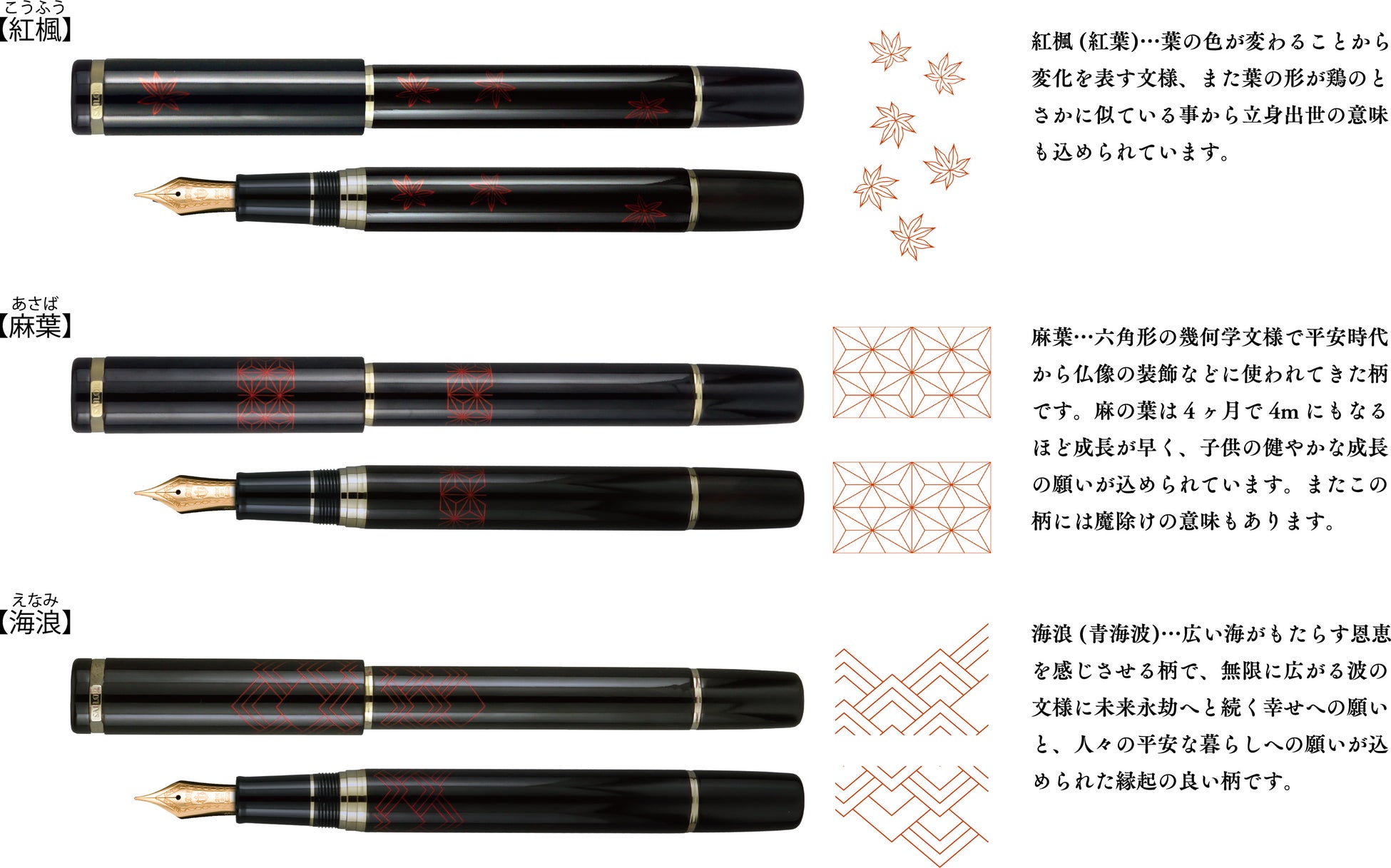 金箔を使用した日本の伝統技法 截金万年筆(きりかね) 紅楓(こうふう)・麻葉(あさば)・海浪(えなみ)