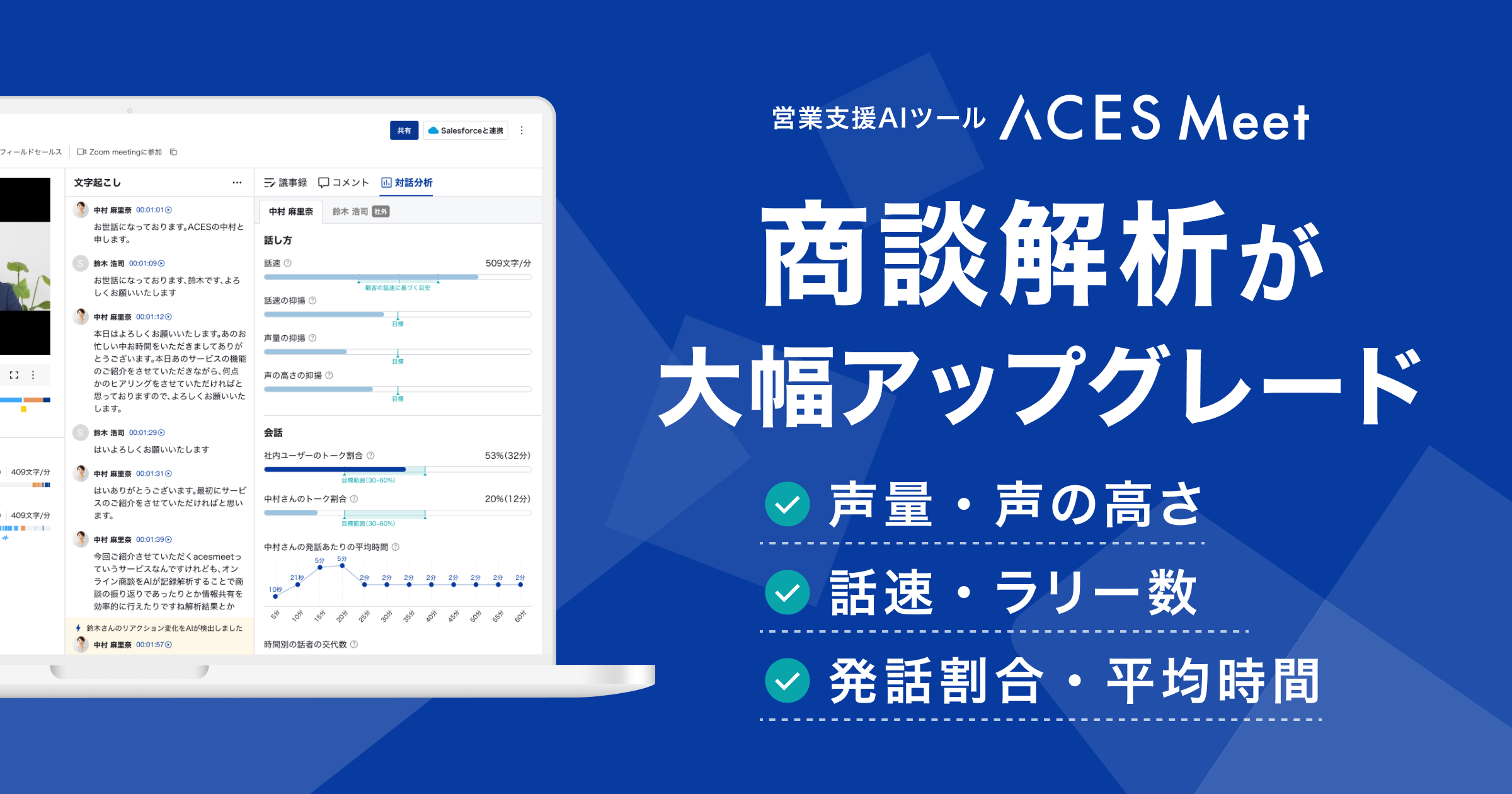 商談解析AIツールACES Meet、声量・声の高さ・話速・ラリー数・発話割合・発話平均時間の分析が可能に